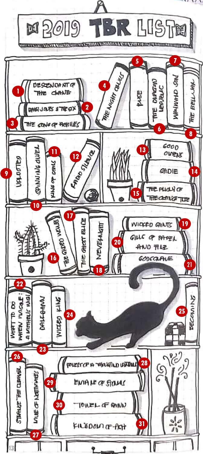 It may be bit late in the year to be sharing TBRs but today, but here I am still sharing with you guys a page in my bullet journal: in which I’ve decided to go a little extra and draw an actual bookshelf. I’m pretty sure I copied the format randomly somewhere in the internet but I forgot where. I basically just drew a bunch of books without regard to number so instead of 40, it only came down to 31. This was made pretty early in the year, and if you are following me in other platforms, this obviously already changed but nonetheless, here they are: