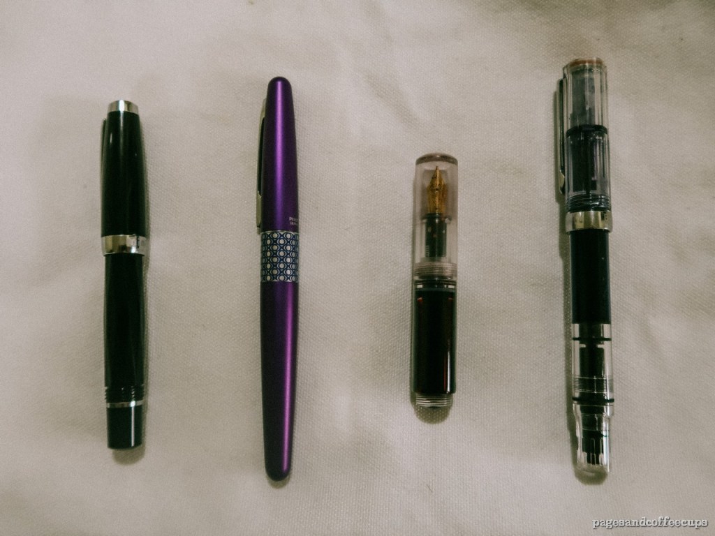 • TWSBI Mini (Black) in F inked with Platinum Carbon Black – This is my personal workhorse for general journaling and drawing, just the right thickness of lines for my taste. Platinum Carbon Black is a bulletproof ink so it is perfect for watercolor and it doesn’t smudge if I highlight over it (I just need to let it dry first). I have to say the ink has a decent drying time in Tomoe River (from my Hobonichi) and Muji papers, where I write most of the time.